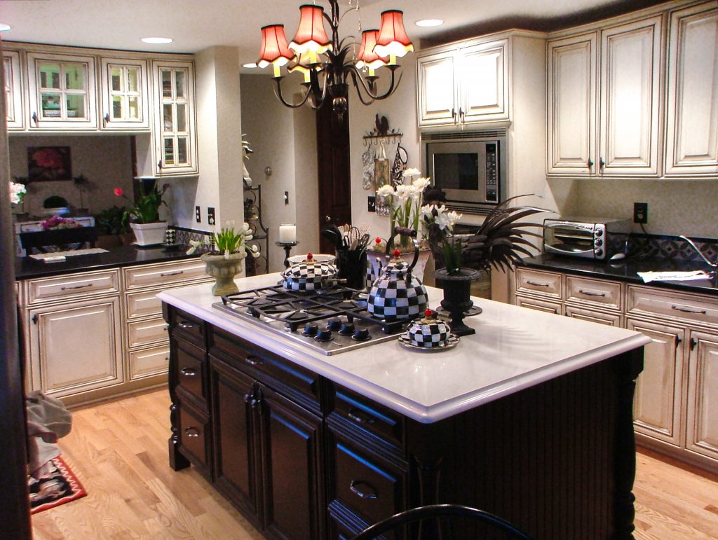 The 1920’s were full of white kitchens, a lot of detail, and fun patterns. A lot of the kitchens had glass cabinet doors, as well. Adding texture on your kitchen doors can create the vintage feel without much effort. This particular kitchen has those touches, and tops it off with black, white and red accents to really keep the retro feel going.